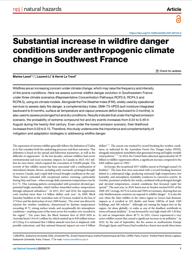Summer 2022 was exceptionally hot and dry in Europe and especially in Southwest France where the most important wildfires since 1949 had serious environmental and socio-economic impacts. An impact-oriented climate change attribution study was conducted and published recently by Marine Lanet (Laboratoire de météorologie dynamique, Sorbonne Université, CNRS) and her colleagues from IPSL (Institut Pierre Simon Laplace, Sorbonne Université, CNRS). The authors firstly investigated an ensemble of climate indices in order to find the most correlated one with the burnt area of the Landes Forest.